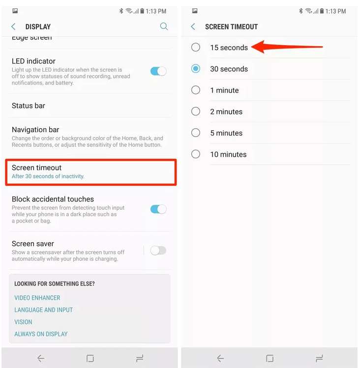 - Defina o tempo limite da tela para 15 segundos ou 30 segundos.