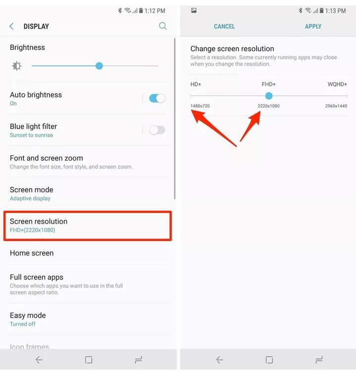A resolução da tela da maioria dos telefones Galaxy, como o Samsung Galaxy S8/S8 Plus, é definida como 2220 x 1080, mas pode ser configurada para uma resolução de tela mais alta, que é 2960 x 1440. Embora definir a resolução da tela para mais alta pareça bom, mas no ao mesmo tempo, também consome mais energia do processador para avaliar cada pixel adicional.