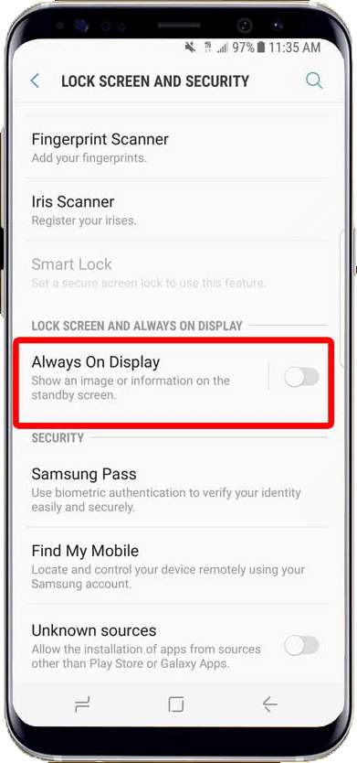 Mesmo assim, parte da tela AMOLED do Samsung Galaxy é muito eficiente e não consome energia ao exibir pixels pretos, no entanto, a tela “Sempre Ligada” do telefone ainda consome um pouco de energia da bateria.