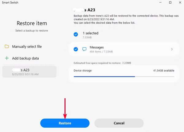 Passo 3: Por fim, clique em “Restaurar” e aguarde o Smart Switch concluir a recuperação de seus dados.