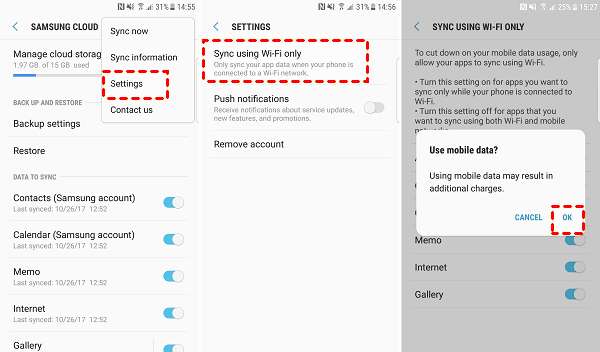 O recurso de cópia de segurança é ativado usando apenas a rede Wi-Fi. Se você deseja fazer cópia de segurança de arquivos usando dados de celular, siga as etapas abaixo para desativar o recurso de rede Wi-Fi apenas para que você possa usar dados de celular para fazer cópia de segurança, o que não criará um problema de conexão e você pode corrigir facilmente o problema de falha no cópia de segurança do Samsung Cloud.