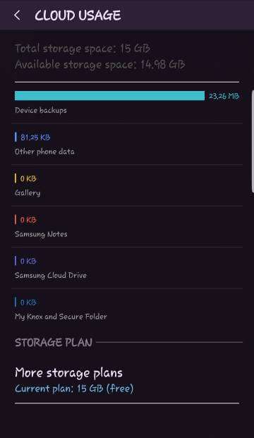 Eu preciso de ajuda! Eu tenho um modelo S9 plus desbloqueado. Todas as manhãs, acordo com uma mensagem de falha da nuvem Samsung dizendo que a nuvem falhou ao fazer cópia de segurança devido à falta de armazenamento! Como você pode ver na minha foto, tenho muito espaço de armazenamento 14,98 disponível em 15G.