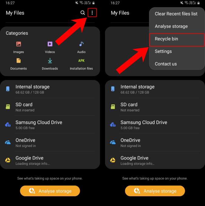 Se você excluiu seus arquivos zip em seu Android a partir do aplicativo Gerenciador de arquivos, pode procurar seus arquivos na seção Lixeira, Lixeira ou Excluídos recentemente em seu Android no aplicativo Gerenciador de arquivos.